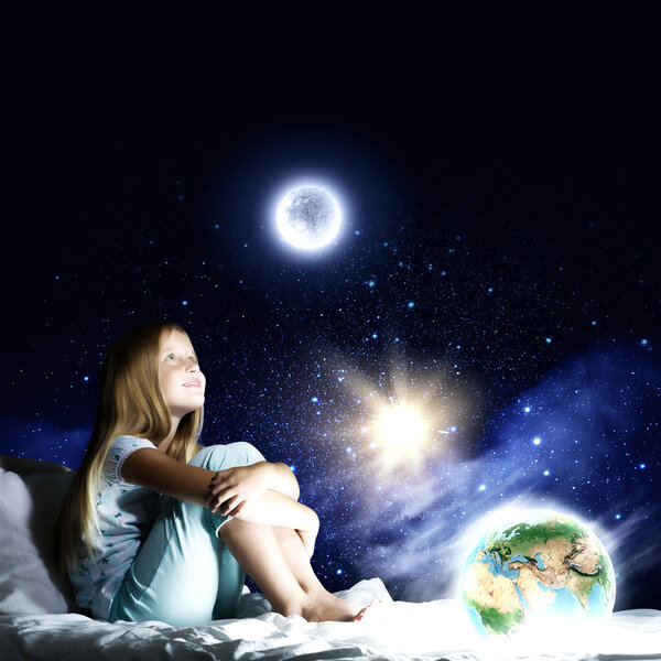 Девушка, сидящая в постели и мечтающая. Элементы этого изображения предоставлены НАСА