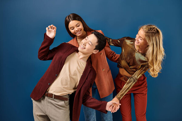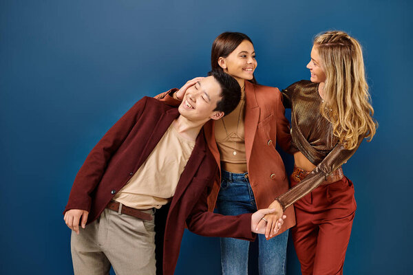 Веселые многорасовые подростки в стильной одежде, веселящиеся на синем фоне, день дружбы