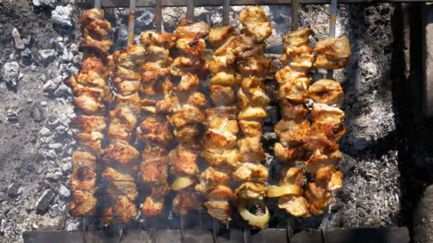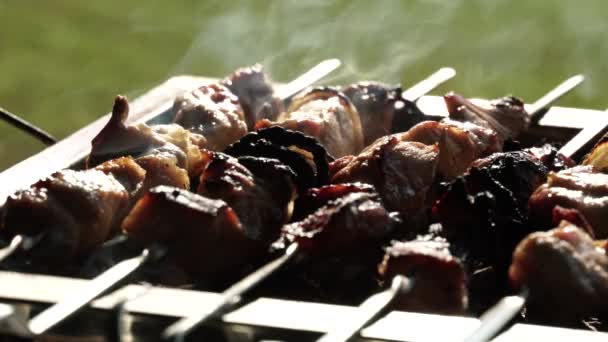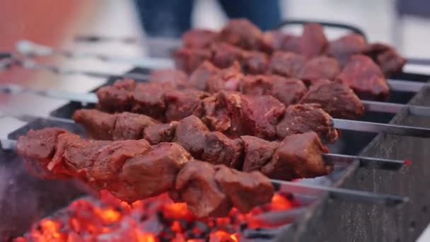 На улице готовят шашлыки из говядины. Крупный план шашлык гриль на открытом огне на открытом воздухе. Мясо свинины на металлических шашлыках для ужина на заднем дворе. Высококачественные 4k кадры