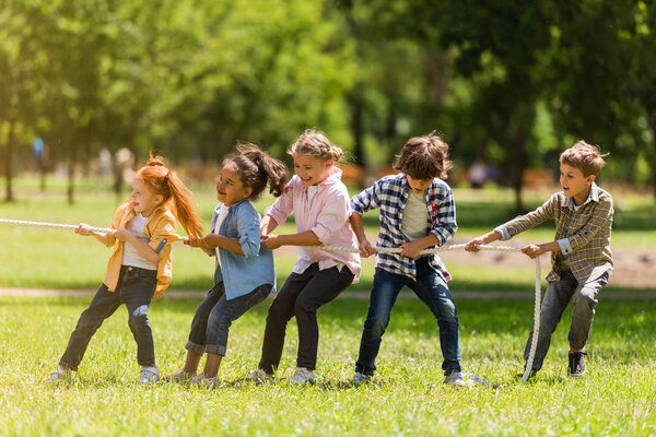 Många olika barn, pojkar och flickor som körs i parken på solig sommardag i casual kläder