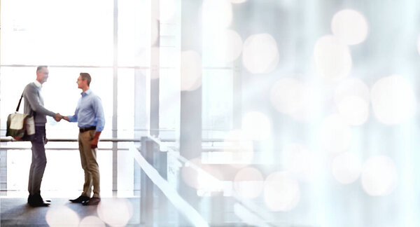 Business people, travel handshake and partnership, welcome or negotiation success for deal or agreement mockup. Professional clients shaking hands for meeting, job introduction and greeting in bokeh.