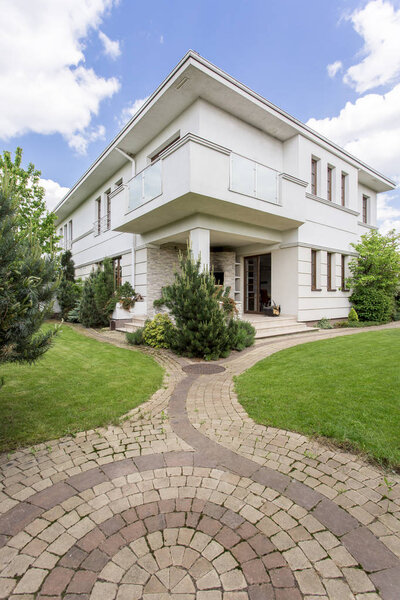 Immobili Esterno Casa anteriore in una giornata di sole. Grande casa di lusso su misura con bel giardino davanti e vialetto per garage in periferia. Casa dal design moderno, Nuova costruzione casa esterna