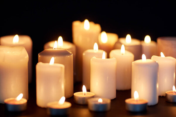 Concept de deuil et de commémoration - bougies qui brûlent dans l'obscurité sur fond noir