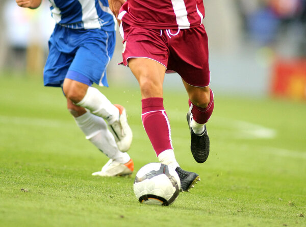 Fußballer in Aktion vor nächtlichem Stadion-Hintergrund