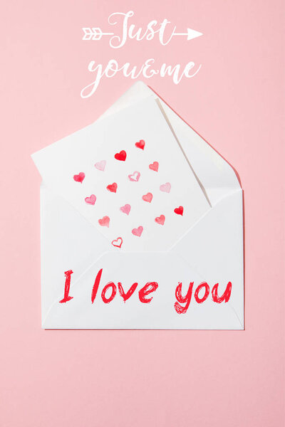 Ansicht der Grußkarte mit Herzen in weißem Umschlag mit i love you Schriftzug auf rosa