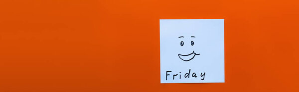 Draufsicht auf fröhliches Emoticon nahe Freitag Schriftzug auf Haftnotiz auf rotem Hintergrund, Banner