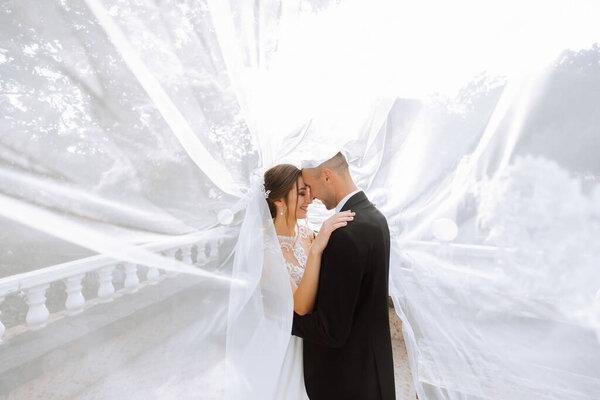 Splendida felice sposa bruna di lusso ed elegante elegante sposo in piedi sotto un velo