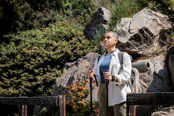 Jovem mulher de cabelos curtos viajante em roupas casuais com mochila segurando postes de trekking e olhando para longe enquanto estava com a natureza no fundo, mulher caminhando por vastas paisagens