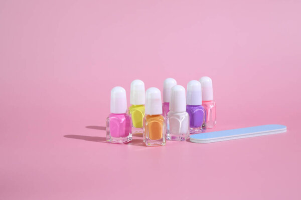 Juego de manicura y pedicura, tratamiento de uñas y equipo de esmalte sobre fondo rosa