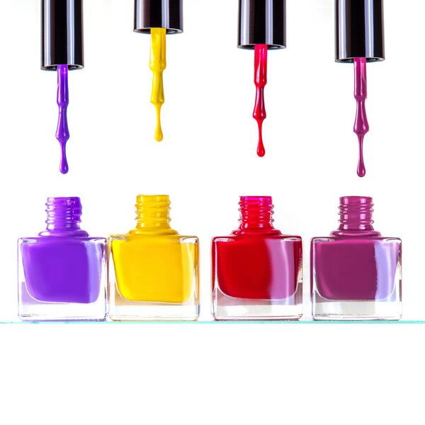 Grupo de botellas de esmalte de uñas de colores brillantes conjunto de diferentes colores sobre fondo blanco, con goteo y cepillo. Manicura abstracta y maquillaje de fondo