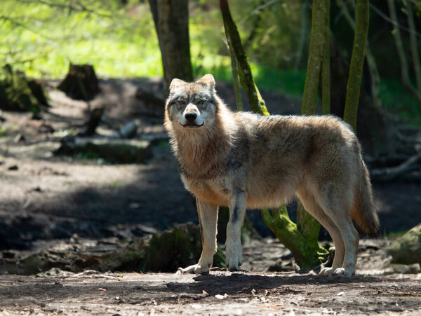 Grey wolf (Canis Lupus) also known as Timber wolf looking right in the forest